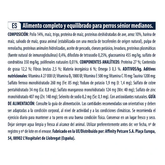 El pienso para perros Affinity Advance Medium Senior +7 pollo y arroz es un alimento formulado específicamente para satisfacer las necesidades nutricionales de los perros de más de 7 años de razas medianas con necesidades propias de su tamaño.