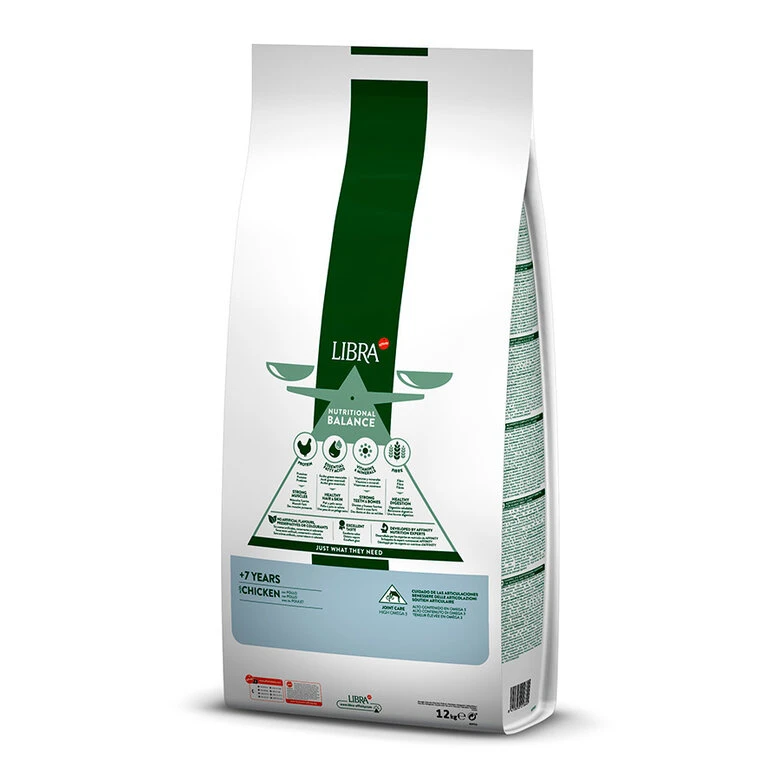 El pienso para perros Libra Affinity 7 con pollo es una deliciosa comida para perros de cualquier raza y tamaño mayores de siete años. Gracias a su bajo contenido en grasas ayuda a cuidar la línea de tu fiel amigo, ya que se suele reducir la actividad física a partir de esta edad.
