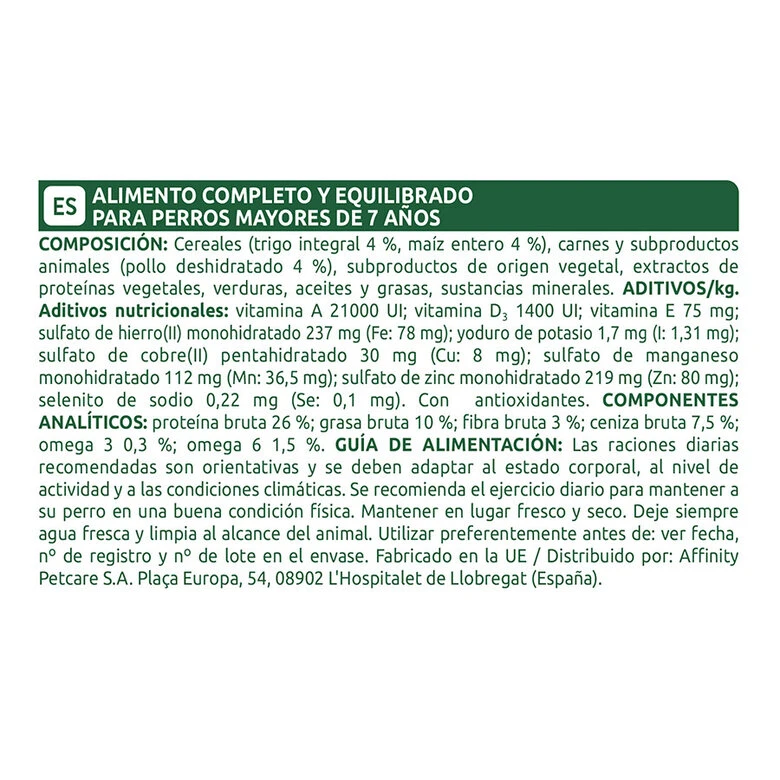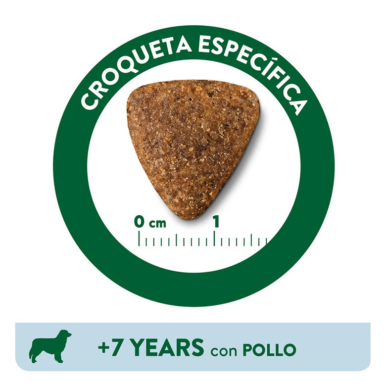 Este pienso para perros de más de siete años incluye en su composición un alto porcentaje de calcio y omega 3 que contribuyen a que sus huesos y articulaciones se mantengan en un estado óptimo. Además, ofrece un alto contenido en proteínas que le ayudarán a tener unos músculos fuertes pese a su edad.