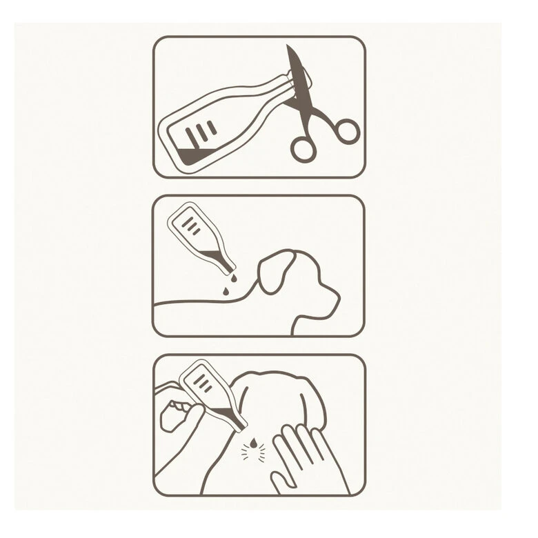 - Separa el pelaje del animal hasta que la piel quede visible. Coloca la punta de la pipeta directamente sobre la piel exterior y aprieta ligeramente varias veces para vaciar su contenido en dos o tres puntos diferentes a lo largo del animal, desde el hombro hasta la base de la cola, dependiendo del peso corporal.