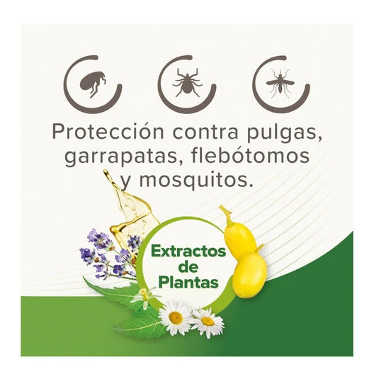 - Actúa contra pulgas, garrapatas y mosquitos.