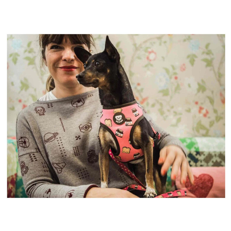 El arnés para perros Dukier Dogtella reversible con dibujos de Nutella te permitirá disfrutar de dos divertidos y originales diseños con tan solo un accesorio. Podrás cambiar el modelo del arnés de tu mascota siempre que lo desees y con tan solo darle la vuelta. Un bonito y original complemento de paseo pensado especialmente para perritas coquetas por su intenso color rosa.