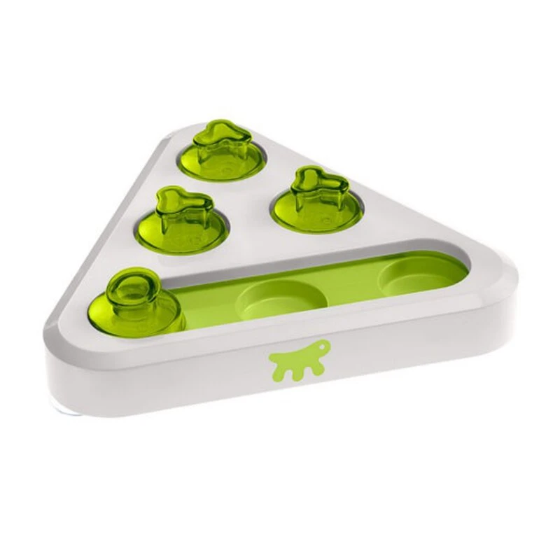 Este juguete de inteligencia para mascotas es perfecto para que tu mascota tenga que usar todas sus habilidades si quiere disfrutar de esa sabrosa chuche. Está compuesto por una plataforma triangular con huecos en los que podrás colocar las chuches favoritas de tu mascota. Después solo tendrás que cubrirlos para ponerle las cosas difíciles.