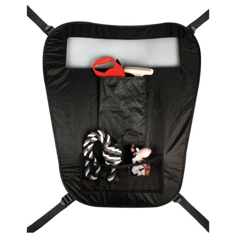 Ajusta la barrera a los asientos delanteros de tu coche para fijarla en su sitio. Guarda en sus bolsillos todo lo que necesites para viajar con tu mascota.