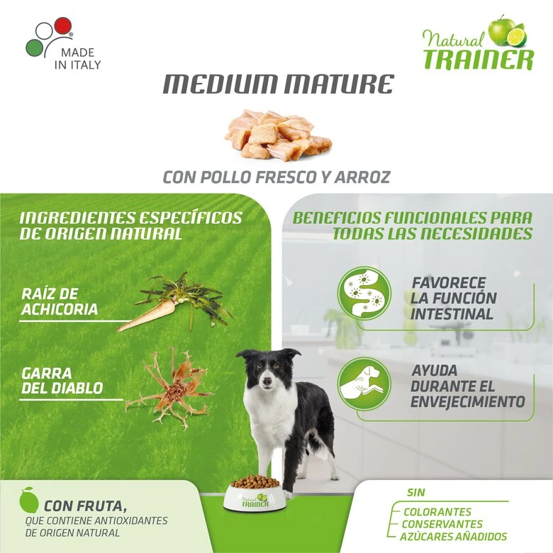 La receta del alimento para perro de Natural Trainer Maturity cuenta con achicoria y clavo del diablo, que lo convierte en la opción más precisa para favorecer la movilidad de tu perro de raza mediana.