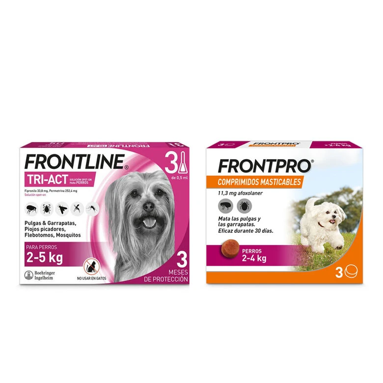 - 3 pipetas Frontline Tri-Act para perros de 2 a 5 kg – Más información sobre este producto aquí.