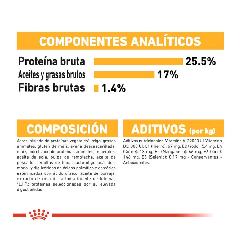 Arroz, gluten de trigo, grasas animales, trigo, gluten de maíz, maíz, avena descascarillada, hígado de ave hidrolizado, minerales, aceite de soja, pulpa de remolacha, aceite de pescado (fuente de EPA y DHA), semillas de lino (fuente de omega 3), fructo-oligosacáridos, aceite de borraja (fuente de ácido gamma linolénico), extracto de Rosa de la India (fuente de luteína).