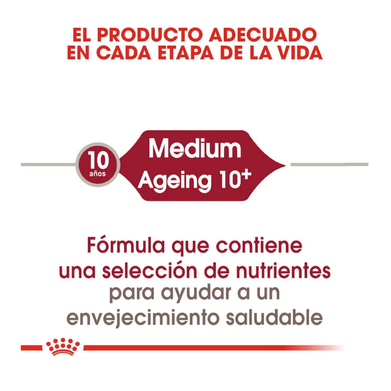 Los caninos adultos de tamaños medios (entre 11 kg y 25 kg de peso adulto) a partir de los 10 años tienen en esta fórmula el alimento ideal. Royal Canin Medium Ageing 10 contiene una serie de nutrientes esenciales y antioxidantes para que los perros mayores tengan un envejecimiento saludable.