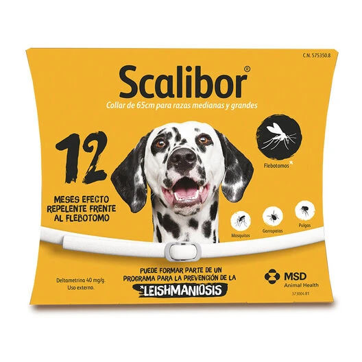 Scalibor es un collar con efecto repelente con duración de 12 meses para flebotomos (Phlebotomus perniciosus) y con efecto repelente durante 6 meses para mosquitos culícidos del complejo Culex pipiens.