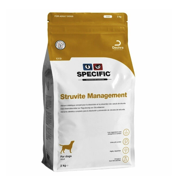 Specific CCD Struvite Management es un pienso para perros con afecciones urinarias como cristales y/o cálculos. La receta de Specific CCD Struvite Management es baja en fósforo y controla el pH de la orina frenando la formación de cristales y favoreciendo una buena salud renal, evitando así que tu perro pueda sufrir obstrucciones e infecciones urinarias. Este pienso además, está elaborado para ser de fácil digestión y ayudará a cuidar la piel y las articulaciones de tu perro.
